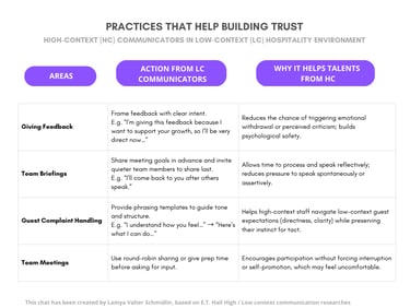 Low-context communication teams can also help integrating high-context communicator by including micro-practices in their daily operation, such as the examples in the table below: