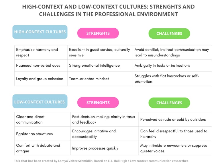 Edward T. Hall defined high-context cultures like Latin American countries, France or Greece as those where communication relies on shared knowledge, relationships, and non-verbal cues. In these settings, meaning is rarely made explicit as it is felt, inferred, or implied. In contrast, low-context cultures, like the Netherlands, the US or Germany prefer clear, verbal, and unambiguous communication, where the speaker takes full responsibility for clarity.